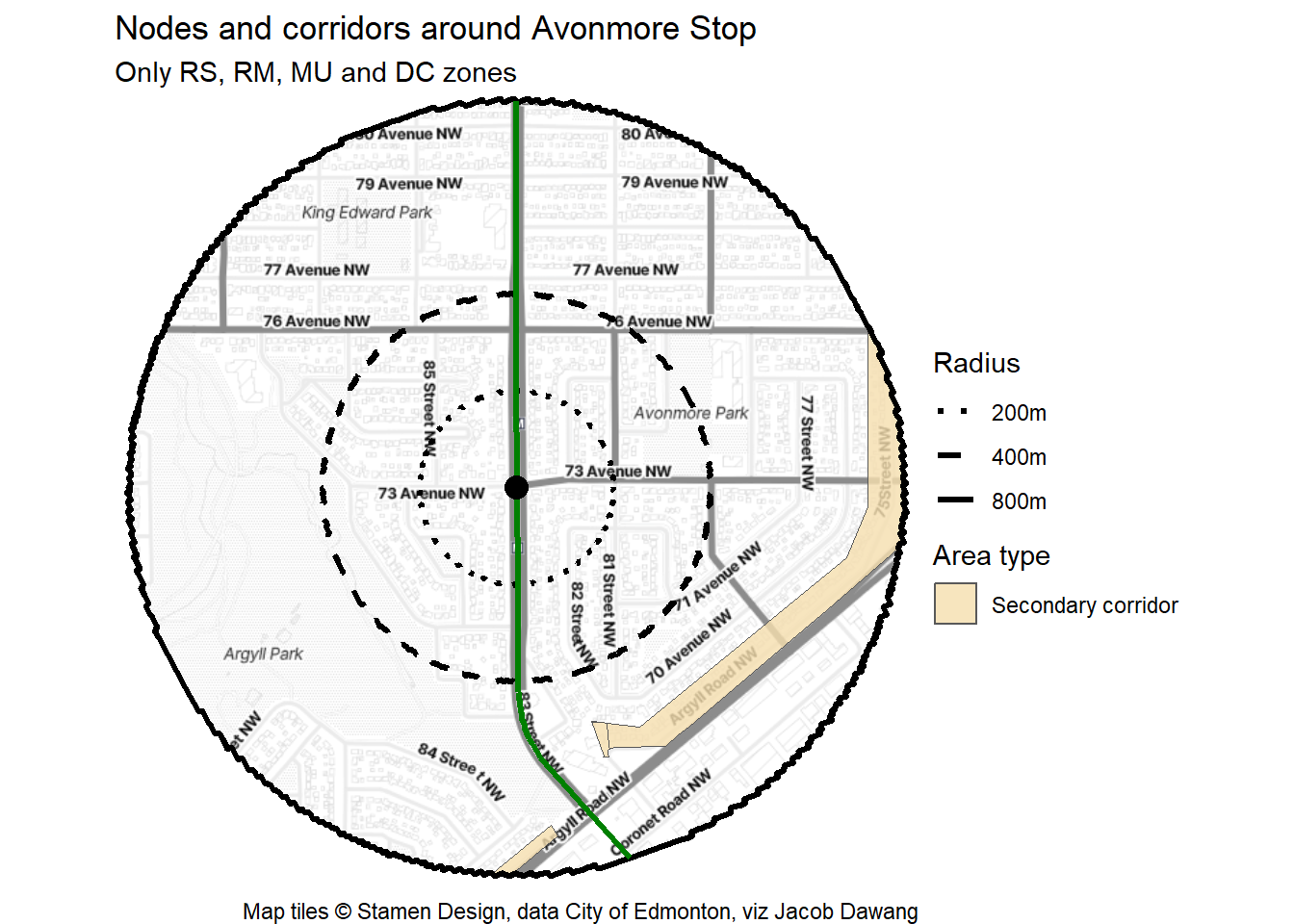A data-driven profile of Edmonton’s LRT station areas using the census, open data and manually-drawn node and corridor boundaries from district planning.