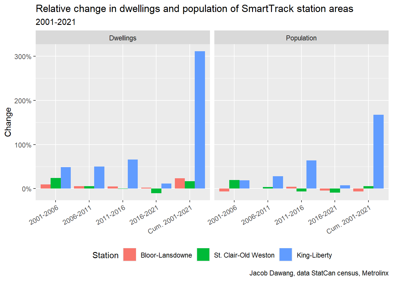 We can also look at growth over the past 20 years. Figure 2 shows the absolute change in dwellings and population. King-Liberty is the station that has grown the most, by a monumental amount, whereas Bloor-Lansdowne has seen negative growth and St. Clair-Old Weston has barely grown.